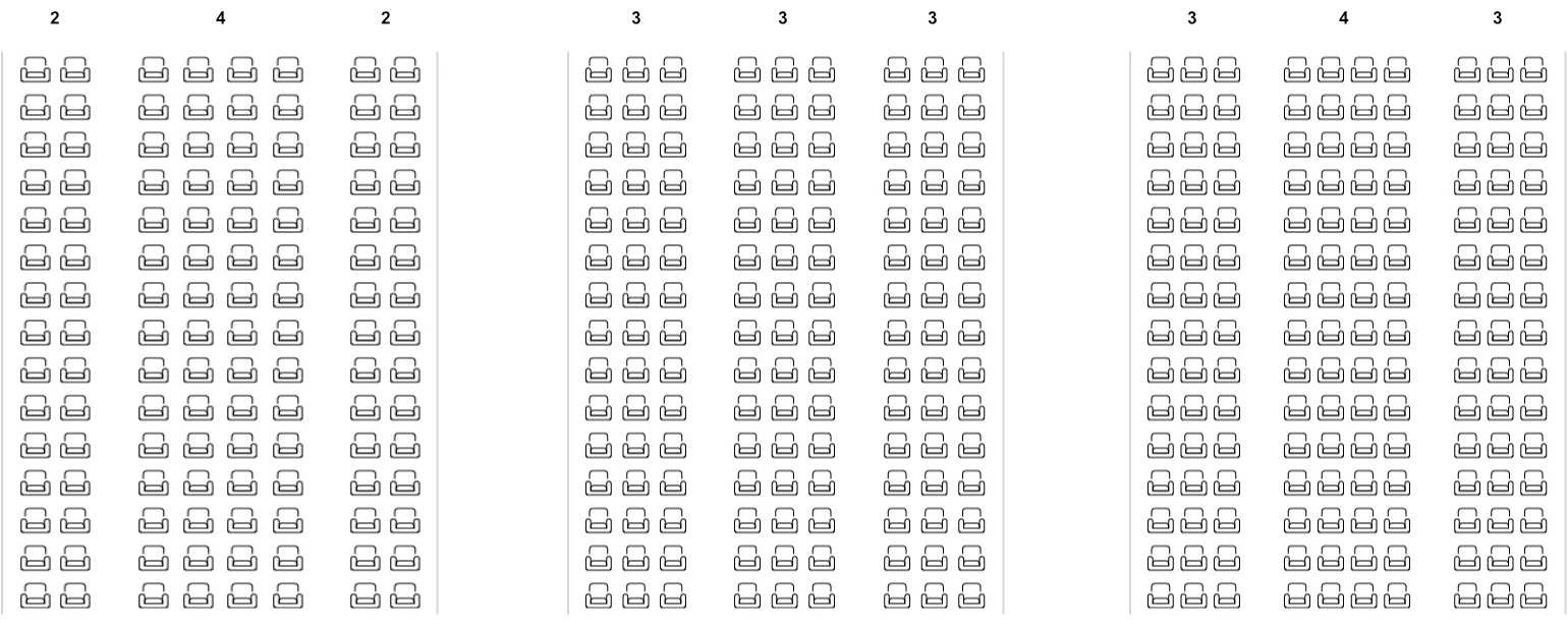 Wide-body economy seat configurations from most spacious to most dense: 2-4-2 (eight seats per row), 3-3-3 (nine seats), and 3-4-3 (ten seats). The fewer seats per row, the wider each seat—with 2-4-2 typically offering 18-19 inches of width compared to just 16-17 inches in 3-4-3 layouts.